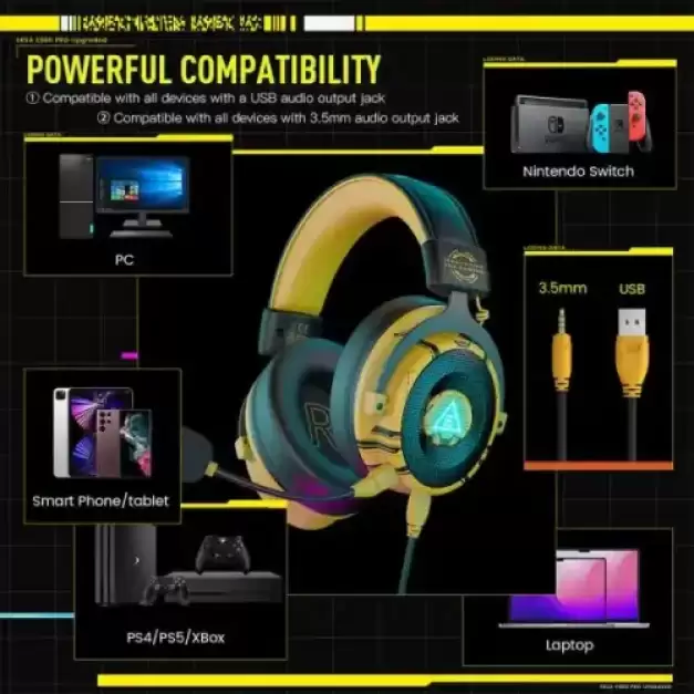 The ESKA E900 Pro Noise Cancelling 7.1 Surround Gaming Headset has 7.1 surround sound and a 50mm diameter driver for stereo surround sound, ensuring accurate sound localization, distinguishing between various audios, and eliminating extraneous sounds. These features make it suitable and ideal for shooting games. The EKSA gaming headphone's embedded omnidirectional microphone has excellent noise-canceling capabilities and can transmit high-quality communication, pick up noises with outstanding sensitivity, and reduce noise, allowing you to send or receive messages while playing. The ESKA E900 7.1 gaming headphone has soft memory protein earmuffs to keep you comfy all day long. To enhance comfort during lengthy gaming sessions, the headband was created with a balanced weight distribution and low clamping force. The EKSA E900 Pro includes features to make operating easier. It contains a one-button mute function, volume control, and several port panels on the outside of the earmuffs. EKSA E900 Pro Noise-Cancelling 7.1 Surround. Gaming The headset has two ports, which provide two forms of sound. The 3.5mm connector delivers standard stereo, making it ideal for both gaming and music. The USB port facilitates professional gaming. 7.1 surround sound effect, ideal for gaming rather than listening to music. 7.1 surround sound only works with the USB interface. EKSA E900 pro-Yellow is compatible with PlayStation 4, Xbox One Controller, PC, Nintendo 3DS, Laptop, PSP, Tablet, iMac, Computer, and Mobile Phone, except the older Xbox One controller, which has a normal 3.5mm audio connector and USB interfaces. It may, however, be attached to the older Xbox One controller with an adaptor. The Nintendo Switch does not support the microphone capability on gaming headsets.