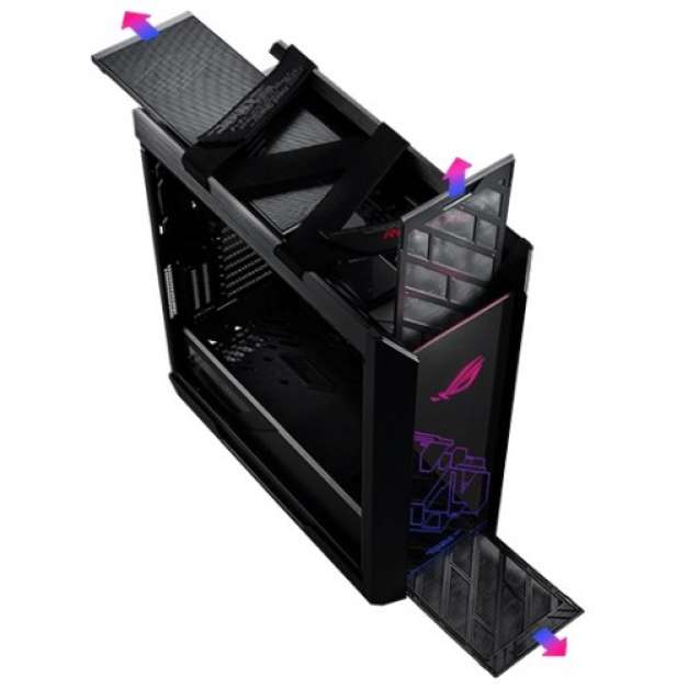 ROG Strix Helios is a premium mid-tower gaming case with three tempered-glass panels, refined aluminum frame and integrated front-panel RGB lighting. Built-in cable management, including a multifunction cover with GPU braces, keeps the interior sharp and tidy. Engineered for expandability and performance, it's ready for an up to EATX motherboard and serious water-cooling setups – making it the perfect choice for a classic ROG showcase build. ROG Strix Helios is made for showcase builds with three smoked tempered-glass panels fitted in a refined brushed-aluminum frame. A stunning display of dynamic RGB lighting is integrated into the front panel to outshine the competition. Featuring integrated addressable RGB LEDs in the front panel that can be customized using a dedicated control button or with Aura software, ROG Strix Helios can cast millions of colors and a range of effects that can be synchronized with a vast ecosystem of components to augment your build. A multifunction cover with GPU braces cleverly hides cabling, provides sturdy support to graphics cards and allows for an SSD or ROG Aura Terminal to be mounted for display. Its position can be adjusted to accommodate an ATX or EATX motherboard. ROG Strix Helios is designed with multiple easy installation mechanisms to provide the smoothest building experience, even for DIY novices. Keeping your rig clean is made easy with built-in dust filters and easy access to all areas. One push of the release buttons at the rear of the case lets you swing down the side panels for instant, tool-less access to the interior. The tempered-glass panels are bottom-hinged, meaning they will remain supported at an angle until you're ready to detach them completely. Fit up to three graphics cards in standard orientation, or two vertically for extra showcase flair using a bundled bracket. Built to perform and primed for expansion, ROG Strix Helios can accommodate an up to EATX motherboard and offers ample space for hardcore water-cooling setups. With support for up to 420mm front and 360mm top radiators, room is also reserved for installing a water-cooling pump and reservoir. The I/O panel is loaded with connectivity, including a reversible USB 3.1 Type-C™ port. It also features dedicated fan speed and RGB lighting controls for making adjustments on-the-fly. Easily carry your prized build to LAN parties using the ergonomic and stylish fabric handles that are rigorously tested to support up to 50 kg.