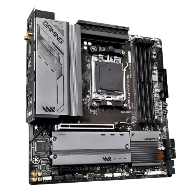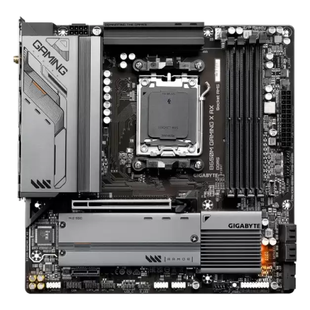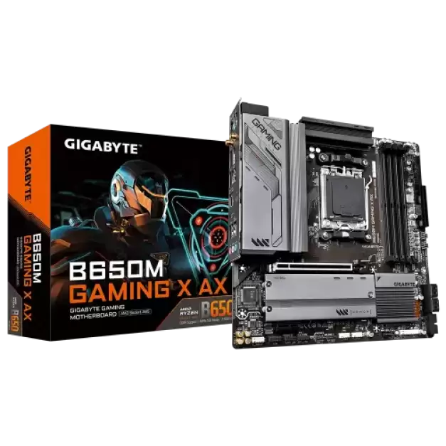 The GIGABYTE B650M GAMING X AX Motherboard is a powerhouse designed to cater to the demands of gaming enthusiasts and professionals seeking top-tier performance and reliability. It seamlessly supports the latest Ryzen 8000/7000 Series Processors with its Socket AM5, making it a future-proof cornerstone for any high-performance gaming setup. The motherboard distinguishes itself with support for up to 192GB of DDR5 RAM across four slots, capable of reaching speeds up to 8000MHz when overclocked. This vast and speedy memory support is further enhanced by compatibility with AMD EXPO and Intel XMP, ensuring easy and stable overclocking for peak performance. Strong visual output is offered by two Display Ports and one HDMI connector, offering a variety of high-definition connectivity choices for immersive gaming or multiple monitor configurations. The motherboard's core technology is a Direct 6+2+1 Phases Digital VRM Solution, which has been painstakingly designed to provide reliable and effective power distribution to crucial system components under a range of load scenarios. The dual-channel DDR5 architecture perfectly complements the high-performance CPUs it supports by increasing system speed and bandwidth. including two PCIe 4.0 x4 M.2 connections for super-fast storage, which drastically cuts down on game load times and guarantees quick data access. Additionally, GIGABYTE has given thermal management a lot of thought. To maintain ideal temperatures and avoid performance throttling during demanding gaming sessions or high workload activities, the company has included an M.2 Thermal Guard coupled with an innovative thermal design. The EZ-Latch design on the PCIe x16 slot and M.2 connections, which enables rapid and tool-free component installation or upgrades, is proof that ease of use is a top priority. With both 2.5GbE LAN and Wi-Fi 6E 802.11ax available, the networking capabilities are state-of-the-art, guaranteeing dependable and fast internet connections whether connected cable or wirelessly. A variety of connectors, such as two Display connectors, two USB-C 10Gb/s, and HDMI, enable extended connectivity and can support a large number of external devices and peripherals. With its FAN STOP feature for silent operation under low loads, Smart Fan 6 technology intelligently handles cooling by utilizing numerous temperature sensors and hybrid fan headers to maximize cooling efficiency and noise levels. Moreover, BIOS upgrades are made easier by the motherboard's Q-Flash Plus function, which streamlines the upgrading and troubleshooting procedure by removing the need to install the CPU, RAM, or graphics card. For those who want nothing less than the finest, the GIGABYTE B650M GAMING X AX Motherboard delivers an amazing combination of performance, expandability, and cutting-edge features. It seems like the perfect option for creating an ultra-high-end gaming PC that defies convention.
