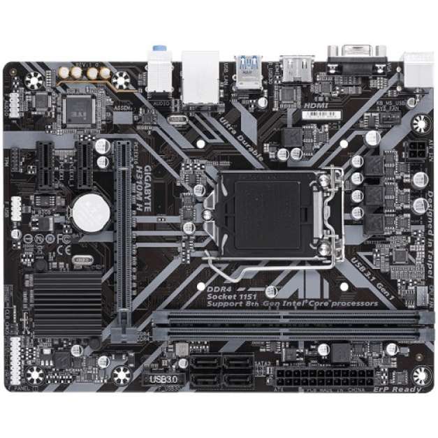 Gigabyte H310M H 8th Gen Micro ATX motherboard compatible with Intel (Socket LGA1151) i3, i5 & i7 processor. This 8-Channel HD Audio with High Quality Audio Capacitor board has dual channel DDR4 maximum 32GB memory and it has the capability of Ultra-Fast SATA 6Gb/s connectors and USB 3.1 Gen 1 interface. If we consider the graphics of this Anti-Sulfur Resistors Design board supports Intel HD graphics having the maximum resolution of 4096x2160@30 Hz for HDMI and 1920x1200@60 Hz for D-Sub port. This High Quality Audio Capacitors and Audio board has 3 x PCIe slot, GIGABYTE Exclusive 8118 Gaming LAN with Bandwidth Management, Smart Fan 5 features Multiple Temperature Sensors and Hybrid Fan Headers with FAN STOP and all new GIGABYTEâ„¢ APP Center which is simple and easy use.