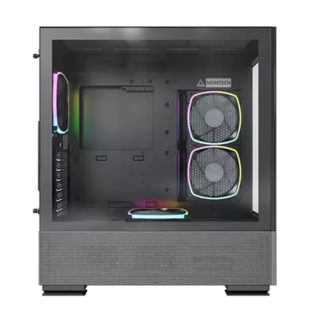 The Montech SKY TWO Mid-Tower Casing incorporates RX120 ARGB PWM with the reversed fan blade particularly created for air intake from the side position and the PSU shroud without losing aesthetics. The enlarged drillings that cover the underside of the front panel to the PSU chamber increase airflow intake, and the inverted fans on the PSU chamber can efficiently suck air in to cool off the GPU.
