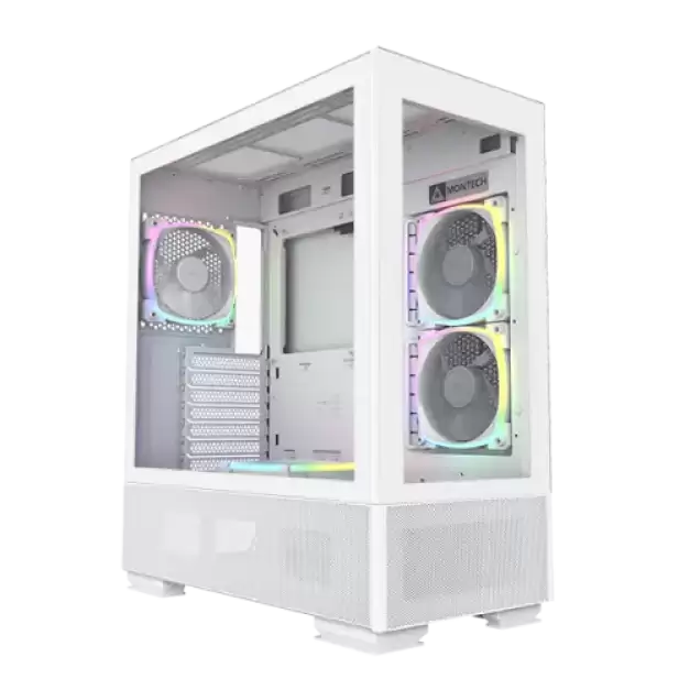 The Montech SKY TWO White Mid-Tower Casing incorporates RX120 ARGB PWM with the reversed fan blade particularly created for air intake from the side position and the PSU shroud without losing aesthetics. The enlarged drillings that cover the underside of the front panel to the PSU chamber increase airflow intake, and the inverted fans on the PSU chamber can efficiently suck air in to cool off the GPU.