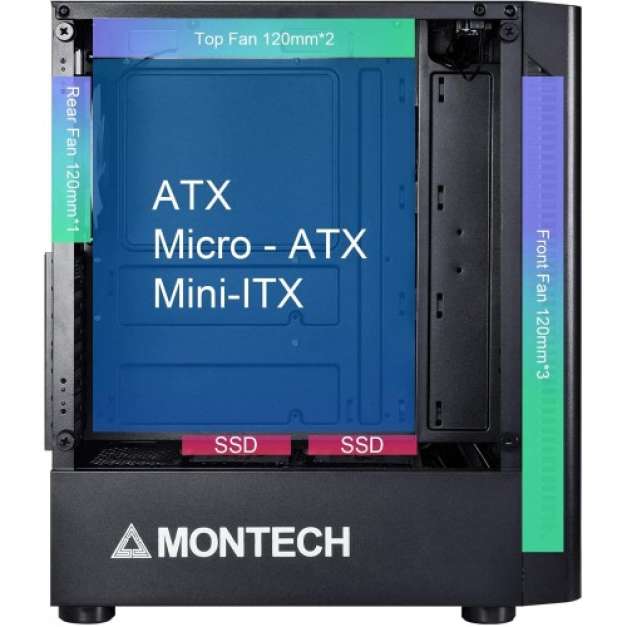 Montech X1 MESH ATX Mid Tower Gaming Case featured with Static Rainbow Fan x 4 Pre- Installed, Unique Mesh Front Panel, High Airflow and Tempered Glass Side Panel. This Montech X1 MESH has 7 Expansion Slots, 2.5"SSD x 3, 3.5"HDD or 2.5"SSD x 1, I/O Port USB2.0 x 2, USB3.0 x 1, Audio x 1, mic x 1, Pre-installed Fan(s): Front: 120mm x 3 (Static Rainbow Fan) Rear: 120mm x 1 (Static Rainbow Fan).