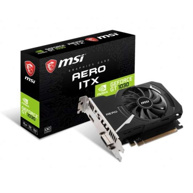 The MSI GeForce GT 1030 AERO ITX 2GD4 OC Graphics Card offers the power of a full-size graphics card in an incredibly small package. MSI AERO ITX graphics cards are perfect for small form factor systems and HTPCs as they only take up a fraction of the space of a full-size graphics card. This means they will fit into virtually any system and ensure a smooth gaming experience. Accelerate your entire PC experience with the fast, powerful NVIDIA GeForce GT 1030 graphics card. Gaming. HD video and picture editing. The GT 1030's award-winning NVIDIA Pascal architecture, powerful graphics engine, and state-of-the-art technologies give you the performance upgrade you need to drive today’s most demanding PC applications. Pascal is built to meet the demands of next generation displays. It features NVIDIA GameWorks technologies for extremely smooth gameplay and cinematic experiences. Pascal-powered graphics cards give you superior performance and power efficiency, built using ultra-fast FinFET and supporting DirectX 12 features to deliver the fastest, smoothest, most power-efficient gaming experiences. The easiest way to optimize your games and keep your drivers up to date, the GeForce Experience application automatically notifies you of new driver releases from NVIDIA. With a single click, you'll be able to update the driver directly, without leaving your desktop. The power of a full size graphics card in an incredibly small package. MSI AERO ITX graphics cards are perfect for small form factor systems and HTPC’s as they only take up a fraction of the space of a full size graphics card. This means they will fit into virtually any system and ensure a smooth gaming experience. The saying “Good things come in small packages” is certainly true for AERO ITX cards. Thanks to its small form factor it will fit into virtually any case. Its compact size also means that its weight is dramatically less than that of a full size graphics card. One of the deciding factors in performance is the quality of the components used. That is why MSI only uses MIL-STD-810G certified components for graphics cards. These components have proven durable enough to withstand the torturous circumstances of extreme gaming and overclocking for extended usage. MSI Afterburner is the world’s most recognized and widely used graphics card overclocking utility which gives you full control of your graphics cards. It also provides an incredibly detailed overview of your hardware and comes with some additional features such as customizing fan profiles, benchmarking and video recording. The MSI GeForce GT 1030 AERO ITX 2GD4 OC comes with 2 years of warranty.