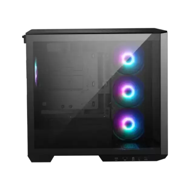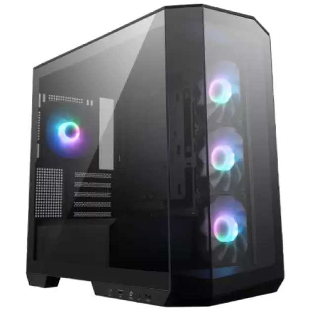 The MSI MAG PANO M100R PZ Micro-ATX Tower Gaming Case is a sophisticated and versatile solution designed for gaming enthusiasts and PC builders who seek both high functionality and striking aesthetics in their setups. This case stands out with its integration of advanced connectivity options, including a USB 3.2 Gen 2x2 Type-C port that ensures high-speed data transmission when paired with a compatible MSI motherboard, streamlining performance and data management. The MAG PANO M100R PZ is its 270-degree panoramic tempered glass panel, which provides an expansive view of the internal components, allowing users to showcase their ARGB lighting setups while maintaining a clean and organized appearance. This panoramic display, combined with support for back-connect PROJECT ZERO motherboards, enhances cable management by routing cables through the back of the case, ensuring a tidy and uncluttered build environment. With room for ten 120 mm system fans and support for up to a 360 mm AIO liquid cooler on top, the casing has excellent cooling capabilities. This guarantees that during long gaming sessions, even the most demanding components may be maintained at ideal temperatures. A reverse-blade fan on the side also helps to increase airflow and enhance overall heat management. Users may easily customize fan speeds and lighting effects using an integrated 1-to-4 ARGB-PWM control board, which makes it possible to create synchronized and dynamic lighting displays across their system. A magnetic dust filter at the bottom of the casing makes maintenance simple. It is easily removable for cleaning, ensuring that the internal components are kept clear of dust and debris. The MSI MAG PANO M100R PZ is also designed with DIY enthusiasts in mind, offering ample space for cable management and component installation. This makes the assembly process straightforward and enjoyable, providing flexibility for various build configurations. The case's emphasis on ARGB lighting, combined with its modern design, allows users to create a visually stunning showcase for their internal components. The MSI MAG PANO M100R PZ Micro-ATX Tower Gaming Case provides a perfect blend of functionality and aesthetic appeal, making it an ideal choice for those looking to build a high-performance gaming rig or a custom PC with a striking visual impact.