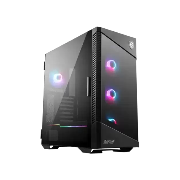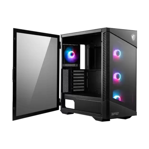 The MSI MPG VELOX 100R Mid-Tower Gaming Case is a powerhouse designed to elevate your battle station with unmatched power and style. Its ventilated front panel with tempered glass showcases mesmerizing ARGB lighting effects, fully customizable with MSI Mystic Light. The Insta-Light Loop button makes controlling the lighting a breeze. Enjoy efficient cooling with side air vents, 4 pre-installed fans, and support for up to 7 fans or a 240mm radiator. The MSI MPG VELOX 100R Gaming Case accommodates 360mm radiators or 3x 120mm fans on the top and front, and vertical GPU mounting is possible with a riser cable. It offers a hinged tempered glass window, magnetic dust filter, front USB 3.2 Gen 2x2 Type C port, and convenient I/O ports. With ample drive mounts, support for large graphics cards and CPU coolers, and compatibility with various motherboard sizes, the MPG VELOX 100R ensures you can build your gaming rig to perfection.