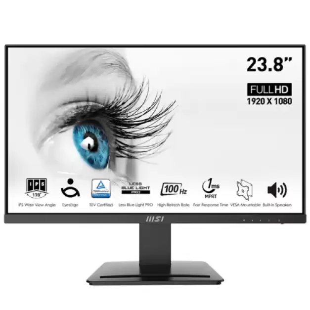 The MSI PRO MP243X is a versatile and strong 23.8" 100Hz IPS FHD monitor designed to increase productivity and deliver a breathtaking visual experience. Its exact screen size makes it ideal for coding, programming, and creating websites since it provides ample screen real estate for multitasking and comprehensive work. The IPS-grade panel ensures exceptional screen clarity with its wide viewing angles and uniform colors, which makes it perfect for streaming, business work, and online movies. This TÜV-certified monitor protects your vision with a Less Blue Light PRO filter that lowers harmful blue light emissions without compromising the color integrity of the screen. You may choose the most ergonomic and comfortable position for extended work hours thanks to the adjustable stand. Furthermore, MSI's Display Kit software offers practical tools for modifying the color and display modes of the monitor, improving your working environment with personalized settings. Suitable for both business and enjoyment, the MSI PRO MP243X boasts a smooth and responsive performance with a 1ms (MPRT) reaction time and a refresh rate of 100 Hz. Many input sources, including DisplayPort and HDMI connections, are included in the connectivity choices, giving you freedom when connecting different devices. The monitor's standard VESA mountable design allows it to be installed on a wall or a monitor arm with ease, saving desk space. The convenience of the monitor is increased by the enhanced 3W built-in speakers, which guarantee you may take part in online conference calls without the need for external speakers. Professionals can work in an ideal workplace thanks to the MSI PRO MP243X, which combines top-notch display technology with features that are focused on the user. Because of its fast refresh rate, eye care features, and ergonomic design, it's a great option for a comfortable and productive work environment.