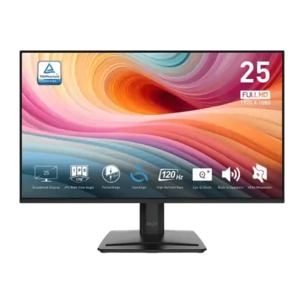 The MSI PRO MP251 E2 24.5" 120Hz IPS FHD Monitor is a flexible display designed for productivity and entertainment, with an excellent combination of performance and visual quality. With a Full HD resolution of 1920 x 1080, the PRO MP251 E2 monitor produces crisp, clear images and text, making it excellent for office work, creative projects, and immersive media experiences. The Rapid IPS panel guarantees rich and accurate color reproduction while also enabling wide 178° viewing angles, ensuring that the pictures are constant from practically any posture. This makes it ideal for multi-monitor setups and group watching. One of this monitor's primary characteristics is its 120Hz refresh rate, which allows for fluid and smooth action, making it ideal for fast-paced gaming or movie playing. With a fast 1ms MPRT (Moving Picture Response Time) and 4ms GTG (Gray-to-Gray), the PRO MP251 E2 monitor provides minimum motion blur and ghosting, offering clear and responsive graphics during action-packed scenes or fast motions in games. Whether you're a gamer or simply appreciate seamless multimedia playback, this display stays up with the times. The MSI PRO MP251 E2 also has Adaptive-Sync technology, which synchronizes the PRO MP251 E2 monitor's refresh rate with the frame rate of your graphics card, preventing screen tearing and creating a smoother, more immersive gaming environment. This function is especially important for customers who want various refresh rates, as it ensures compatibility with a variety of gaming systems. The display has one HDMI and one DisplayPort port, allowing it to connect to a variety of devices like PCs, game consoles, and laptops. The monitor's headphone output allows for simple private listening, making it an ideal all-in-one option for multimedia and gaming sets. Furthermore, the anti-glare coating lowers reflections, reducing eye strain during extended periods of work or gaming, and assuring comfort even in highly light surroundings. All of these functions are housed in a sleek, modern design, making the MSI PRO MP251 E2 not only useful but also visually appealing in any workstation or gaming station.